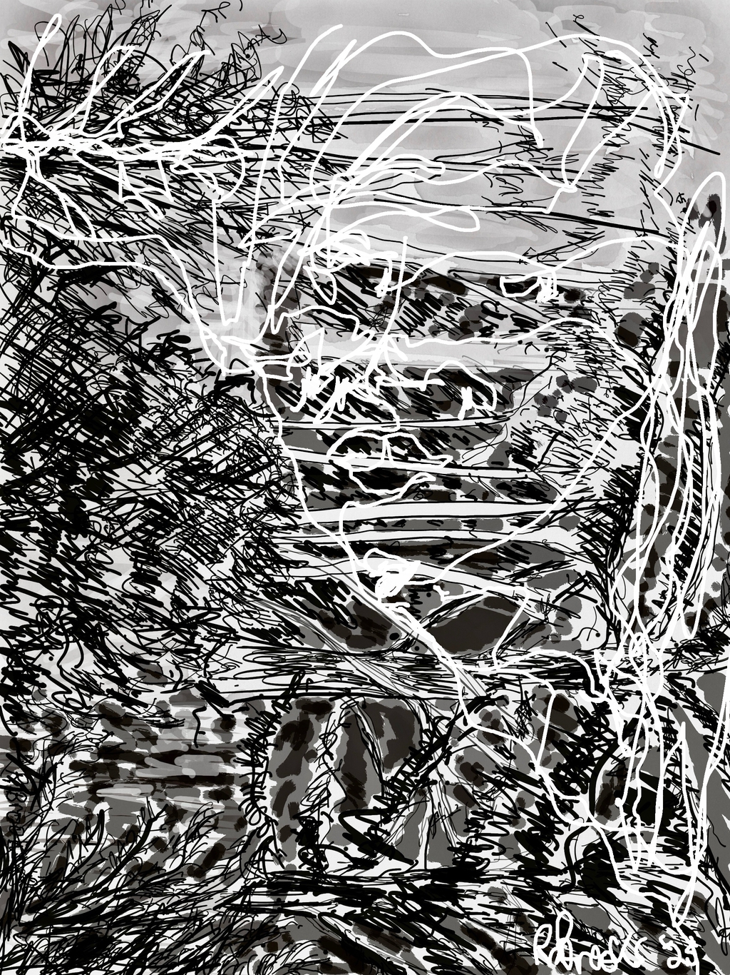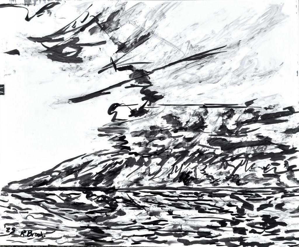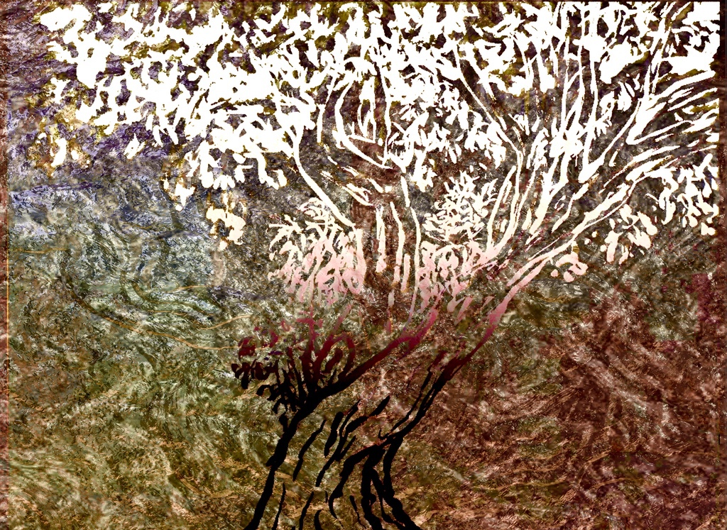 "Palm Desert, Olive Tree BW, #120BW" digital re-work of brush & sepia ink 14" x 17"